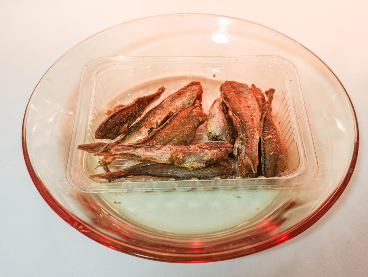 这个也是小盘子装的。看起来像是一整条小个头的鱼做的。