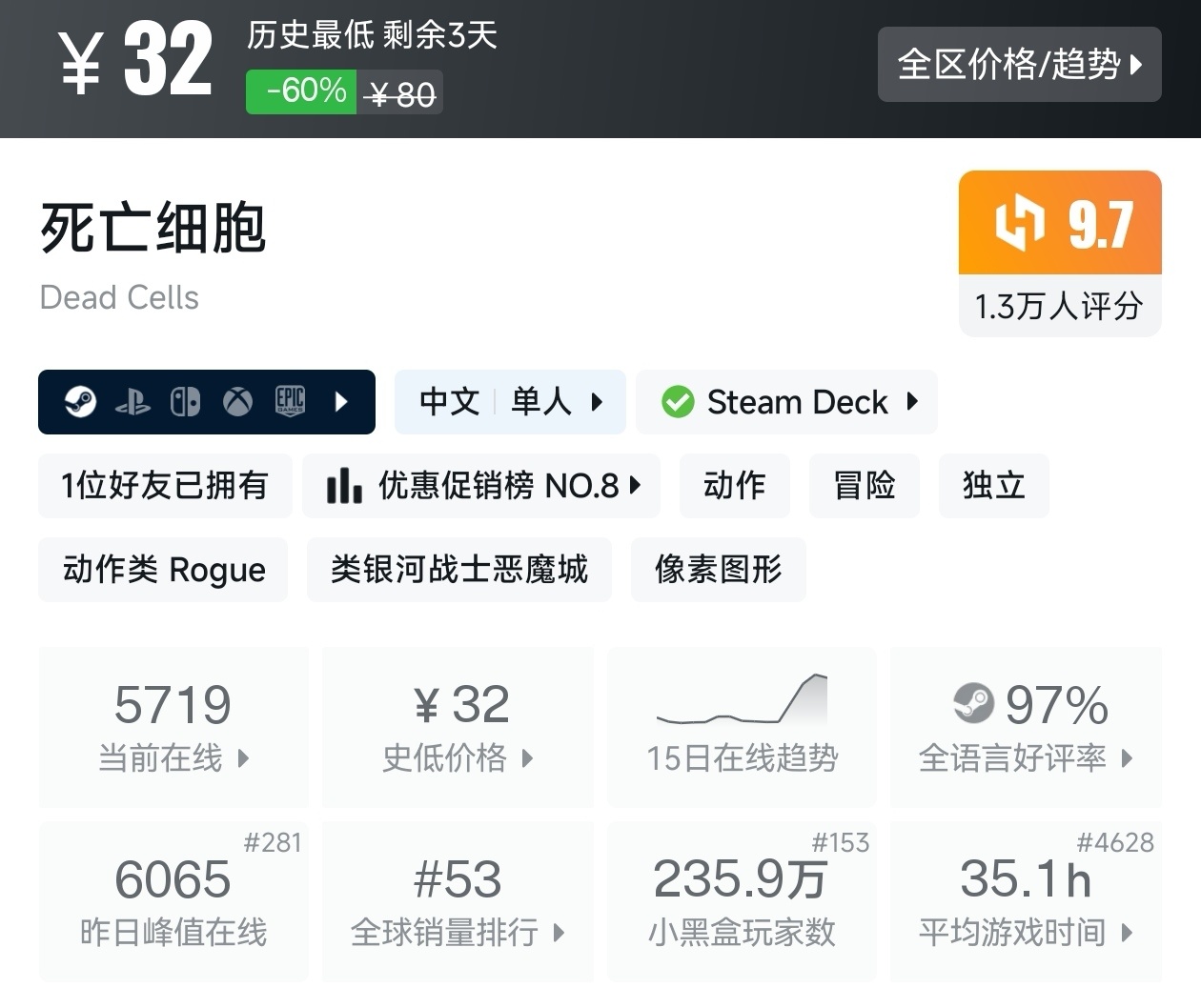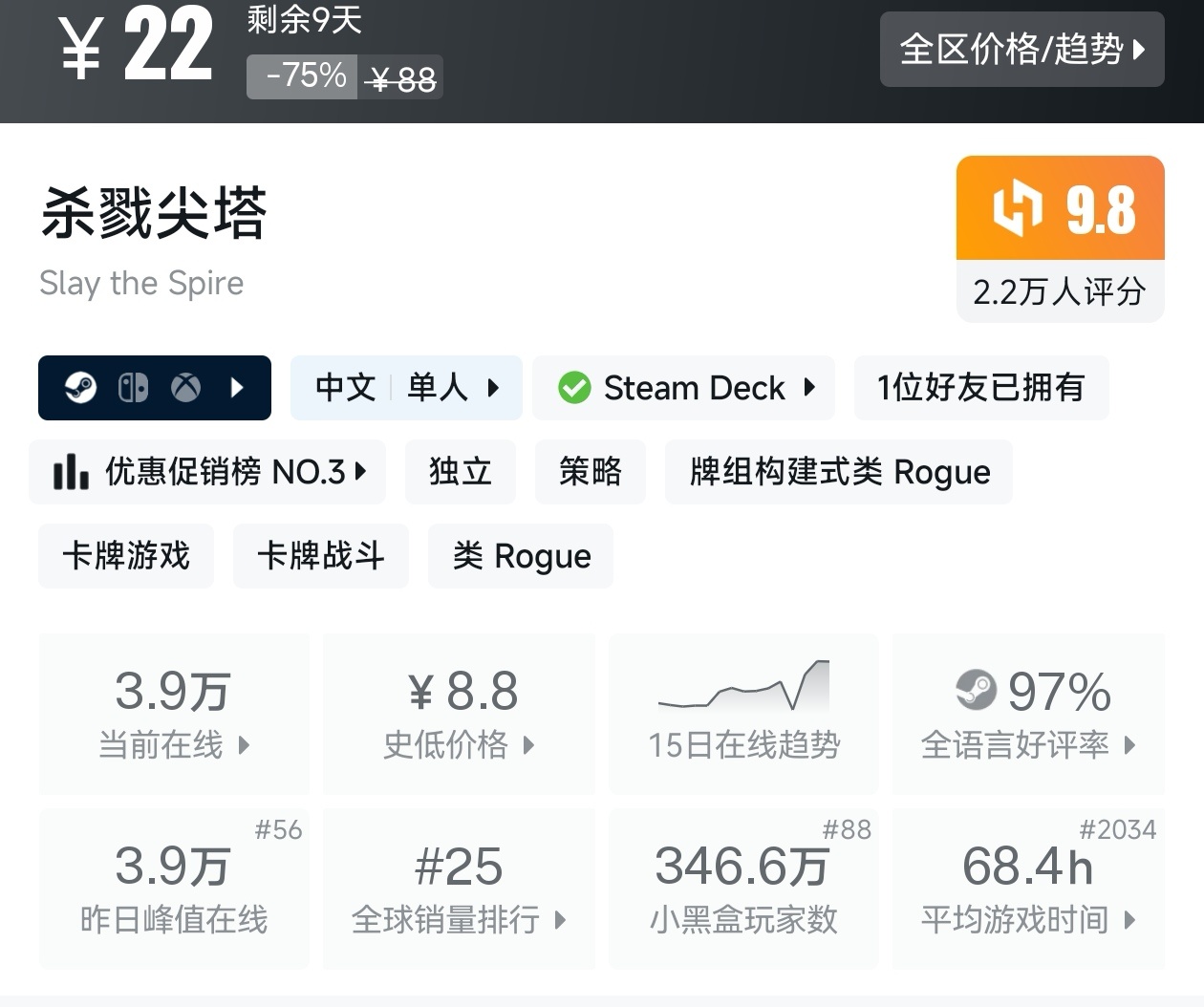 大家好,没错,又是我,你们的老朋友亦然,在最近,有很多游戏都在打折,毕竟因为马上就到春促,当然,其中就有很多肉鸽游戏,尖塔也打折,不仅拥有很高的性价比,同时游戏质量也很顶级,当然有些游戏黑盒商城才打折,我将为各位进行一个汇总,希望我的汇总,能够帮助各位盒友挑选心仪的游戏。