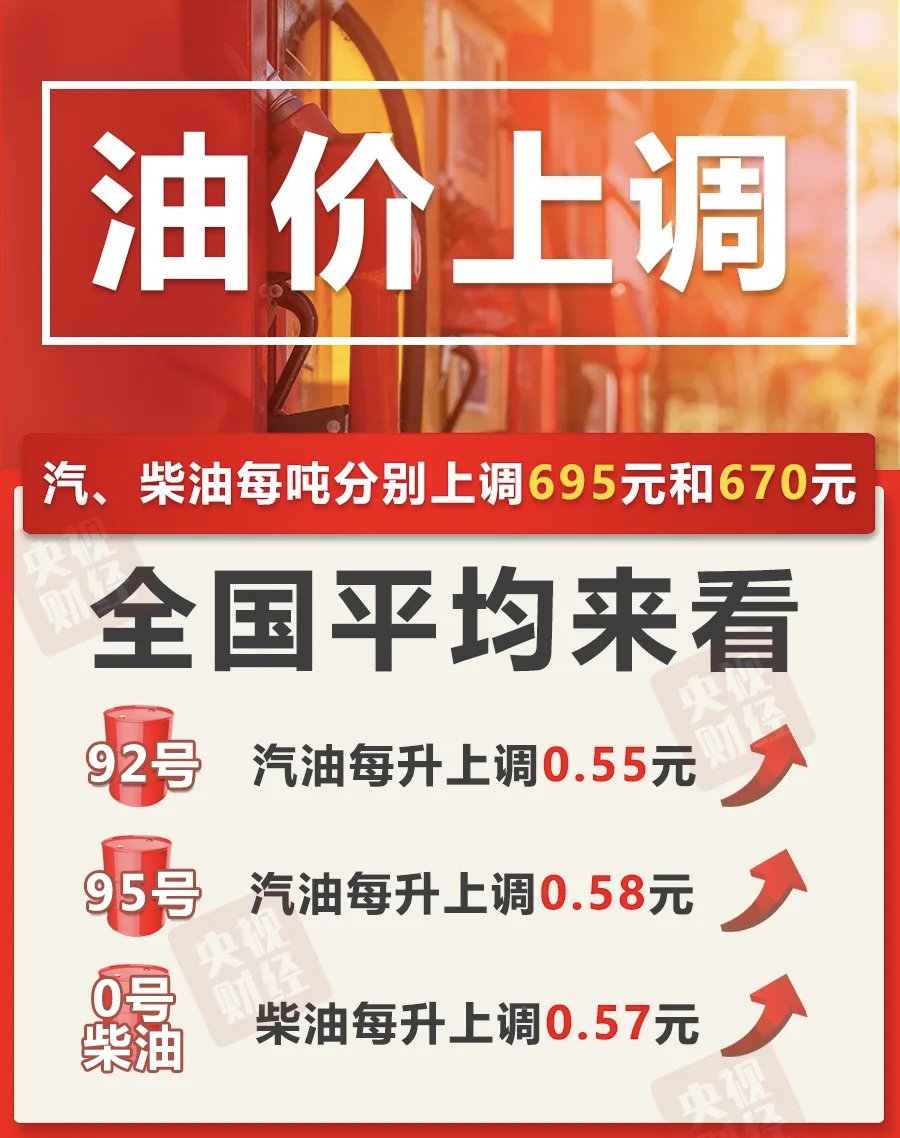 据卓创资讯数据,截至 3 月 5 日收盘,国内第 9 个工作日参考原油变化率为 11.35%,预计汽柴油上调 500 元/吨。折合升价后,92 号汽油、95 号汽油、0 号柴油将分别上涨 0.39 元/升、0.41 元/升、0.42 元/升,加满 50 升 92 号汽油将增加支出 19.5 元。