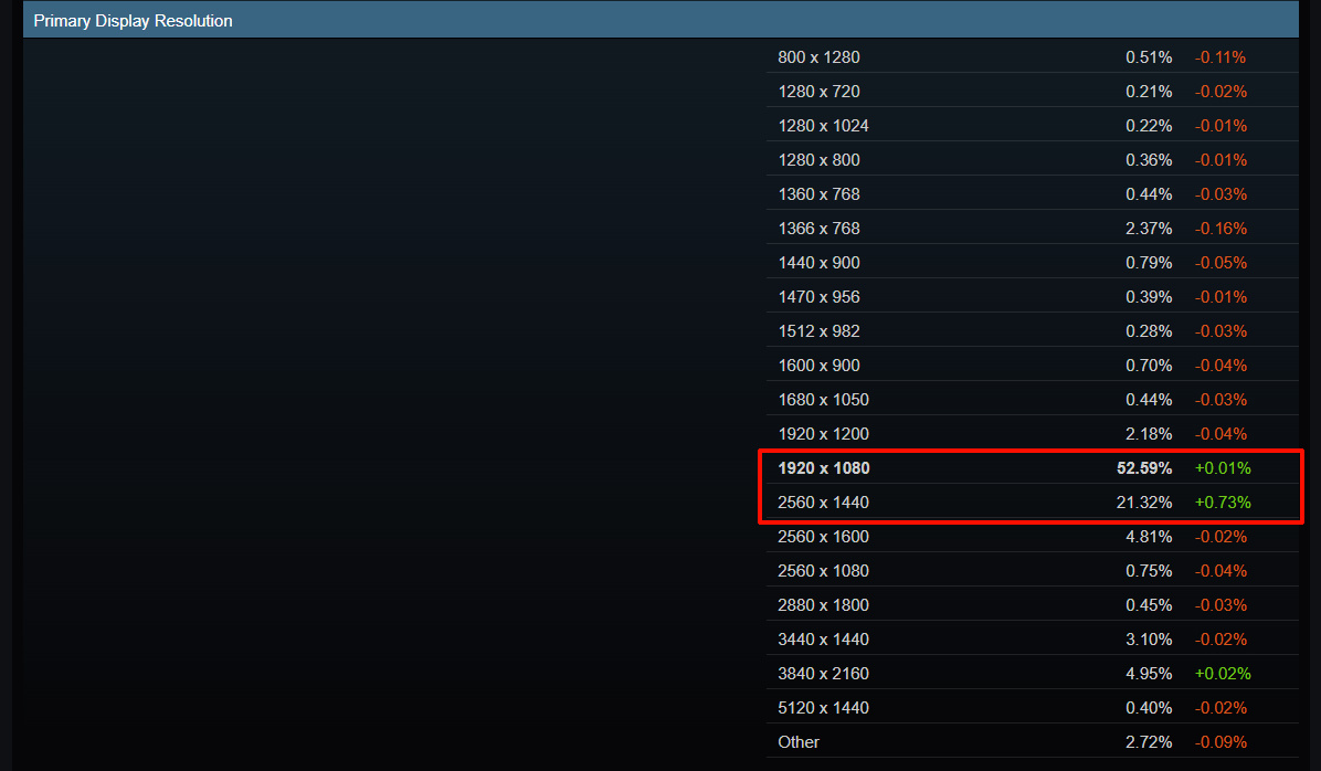 最近我又看了一眼Steam的硬件调查,发现一个有意思的现象:仍然有一半以上的PC玩家在使用1080P分辨率,而且是断崖式领先。