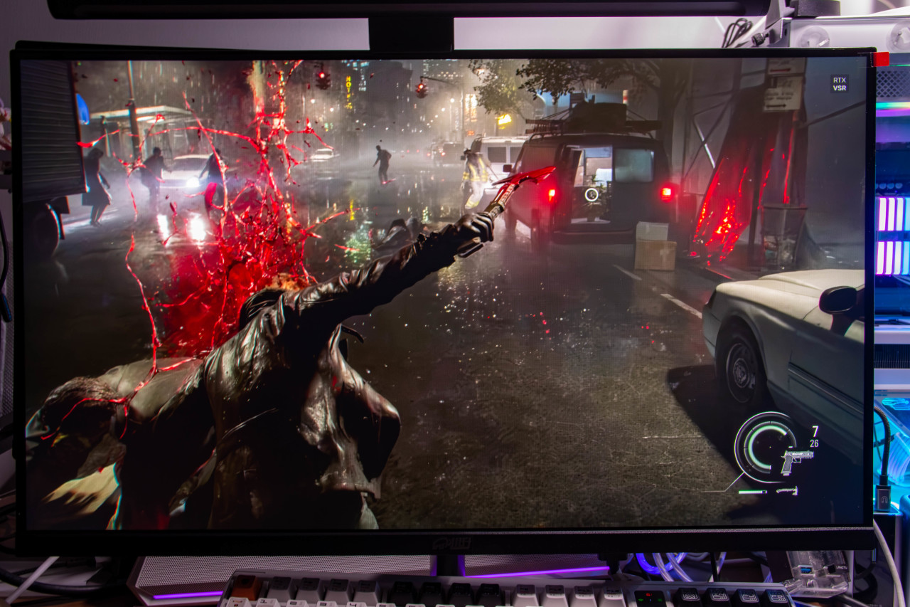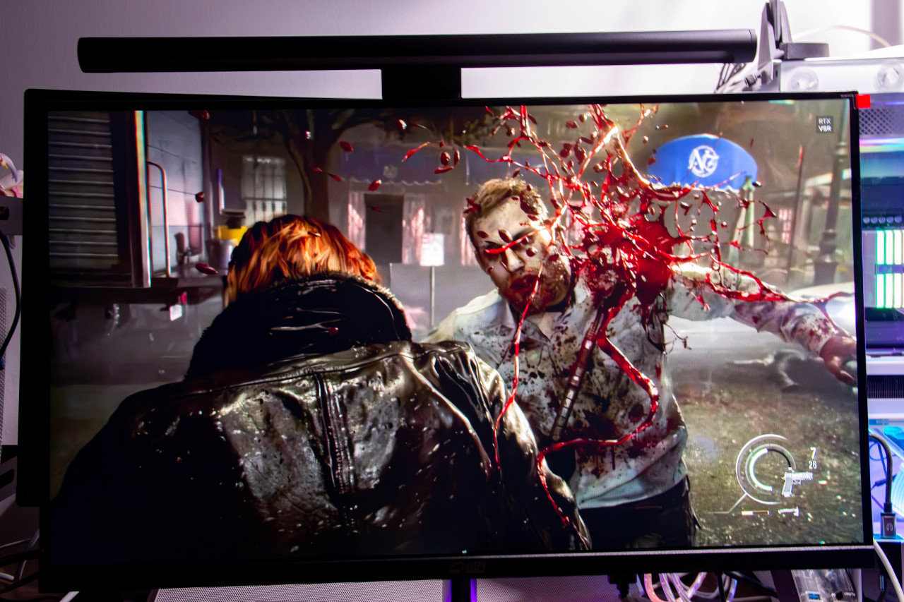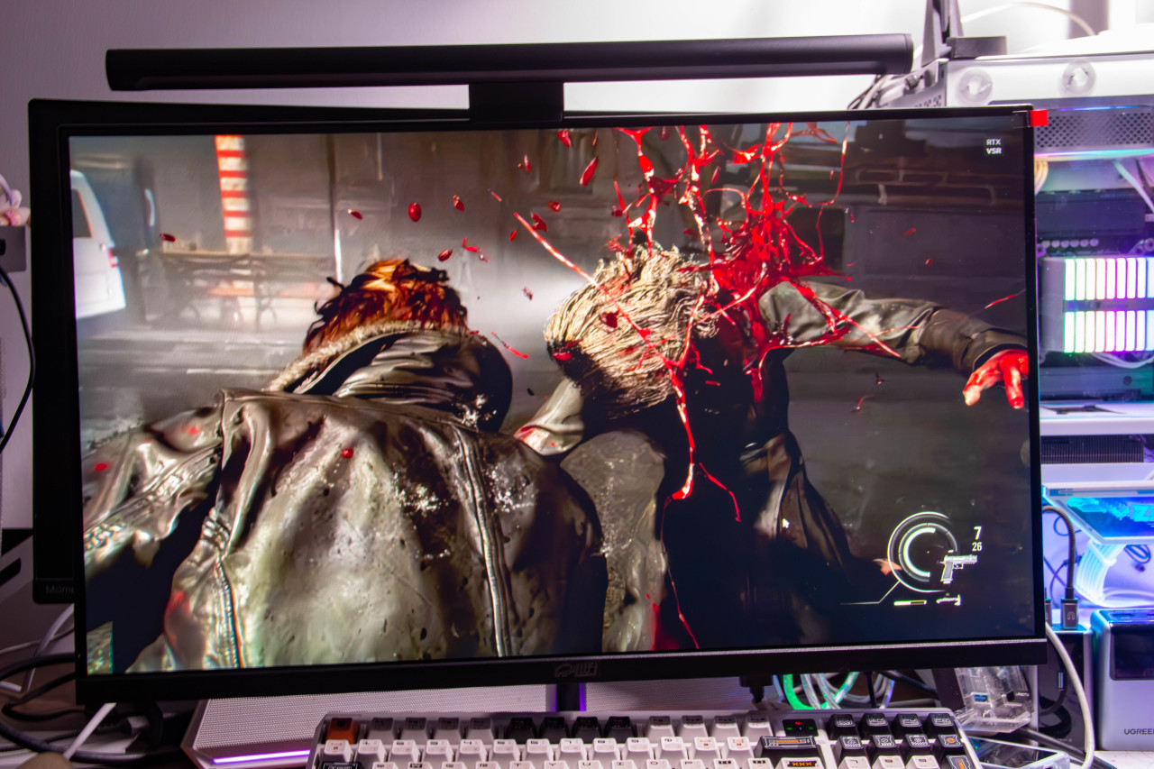 直接用《生化危机安魂曲》演示一下,可以看到里昂手斧砍丧尸是会飙血的。这里血液的红色和车灯的红色都非常鲜艳,一眼就可以看到。
