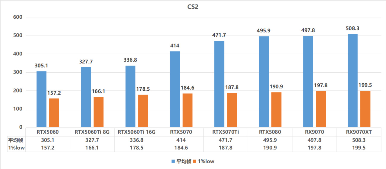 CS这边:从5060到5080,帧数基本都在300帧以上,而从5070开始,直接冲到400帧往上走