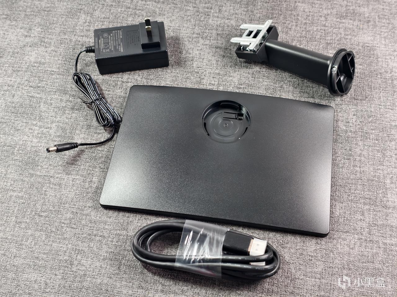 可以看到这就是全部的配件,一个电源适配器,还好并不是流星锤在中间啊,估计功耗也不高。再加上一个小支架和一个平面底座(现在给平面底座的显示器才是好文明,桌面寸土寸金,有一个平面底座能节约更多空间出来),底座是塑料的,支架是铁的。