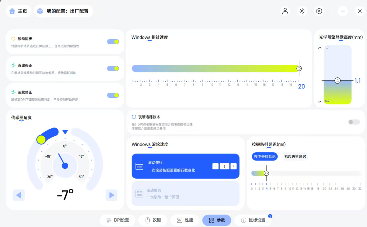 除了这些基础的还有移动同步/直线修正/波纹修正。如果你日常喜欢歇着用鼠标,雷柏为了防止你鼠标指正偏移严重,还可以调节传感器角度。为了保持玻璃垫用户的稳定性,还有专门的玻璃追踪速度