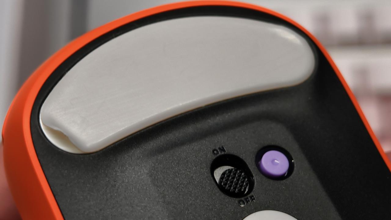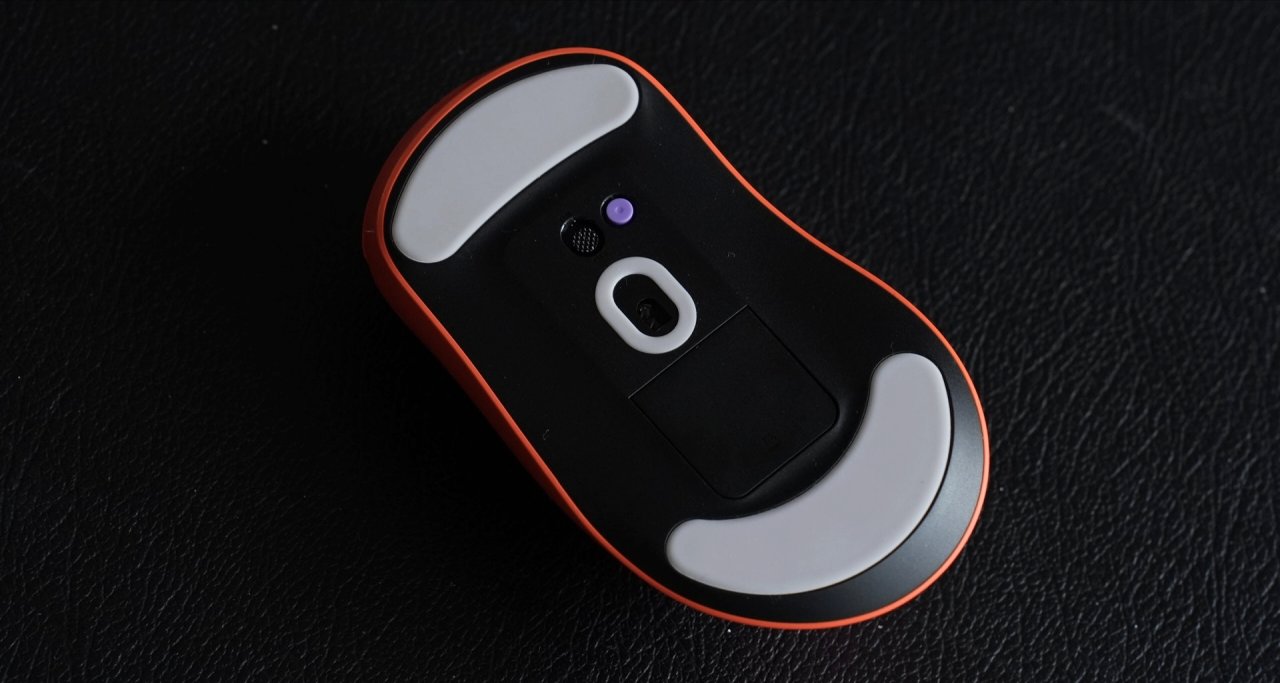 鼠标的底部布局简洁,可以贴上赠送的特氟龙脚贴提升顺滑度,传感器方面采用了中置布局,上方两个按钮分别为电源开关(黑色)以及自定义按钮(紫色),默认更改DPI键,后续可以改为其他的,并且因为在底部可以防误触。