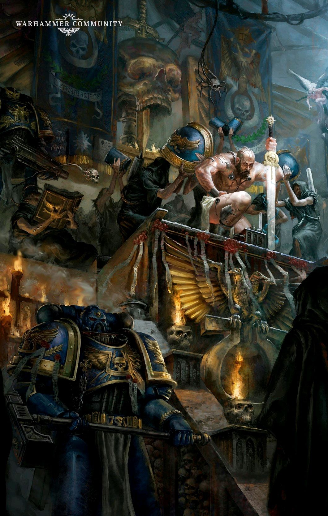 泰拉围城战中,数百名身着天鹰型装甲的禁军,死守永恒之门与黄金王座的最后防线,对抗荷鲁斯的数百万叛军、混沌恶魔军团,甚至直面恶魔原体的冲击。