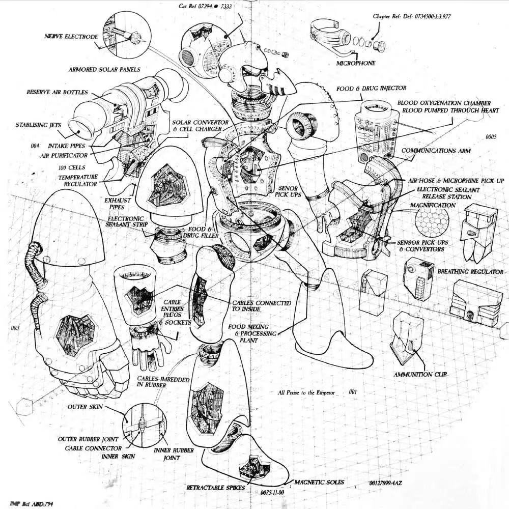 装甲内部布满电动纤维束(Electro-motivated Fibre Bundles),通过伺服电机与神经接口精准复刻穿戴者动作,将阿斯塔特的超人体力进一步放大,使其轻松挥舞重型武器、翻越障碍、承受后坐力,同时保持战术机动性。
