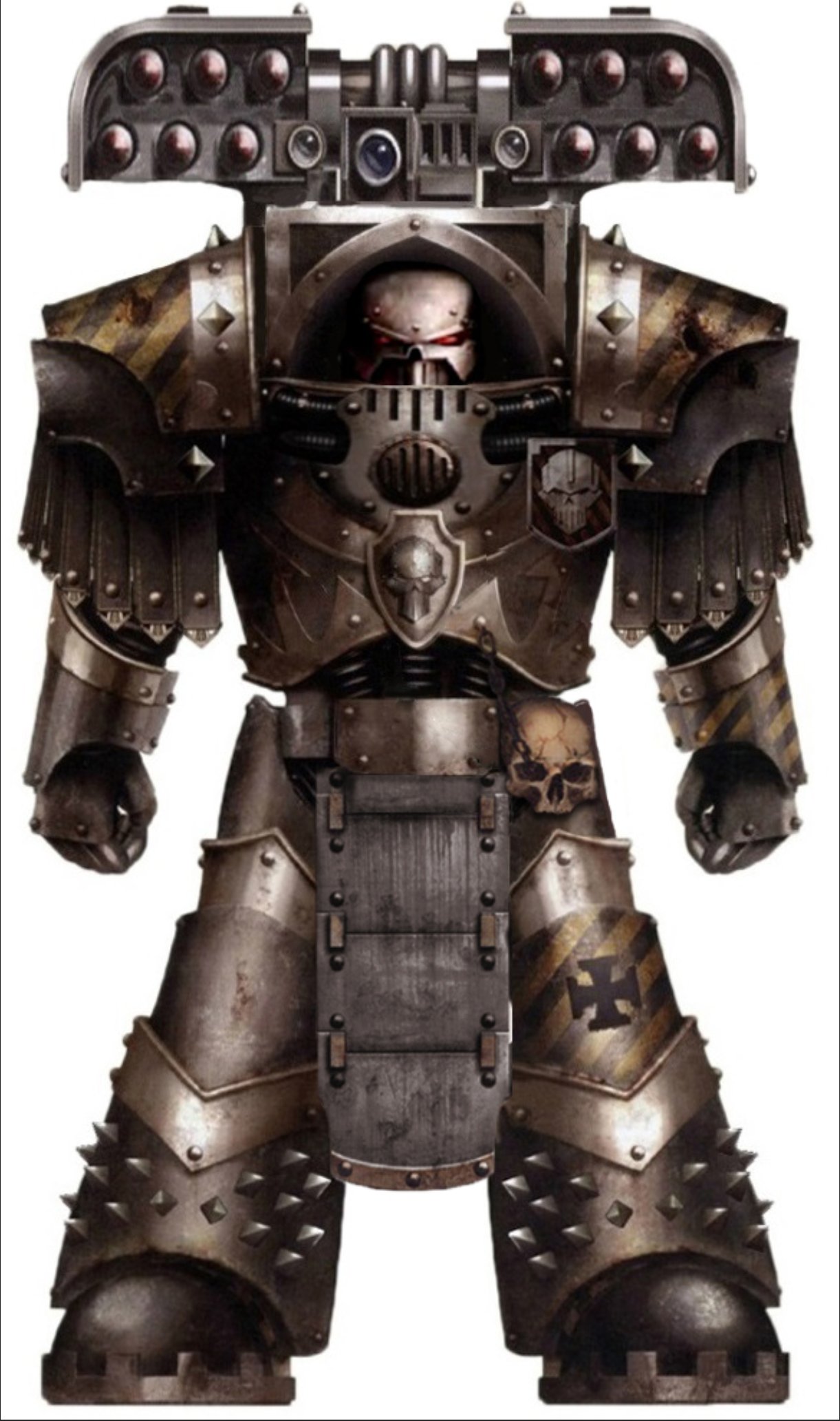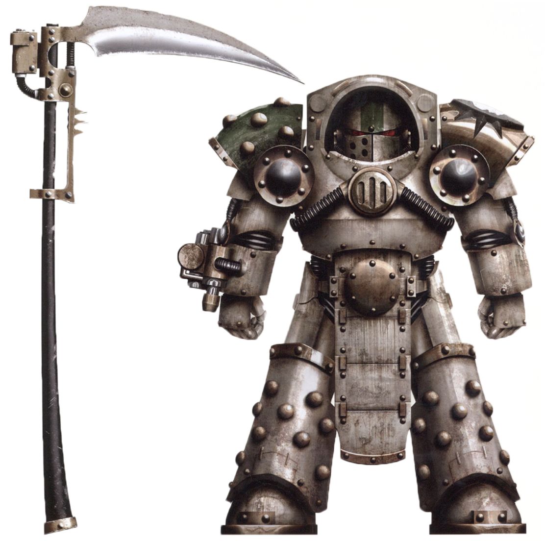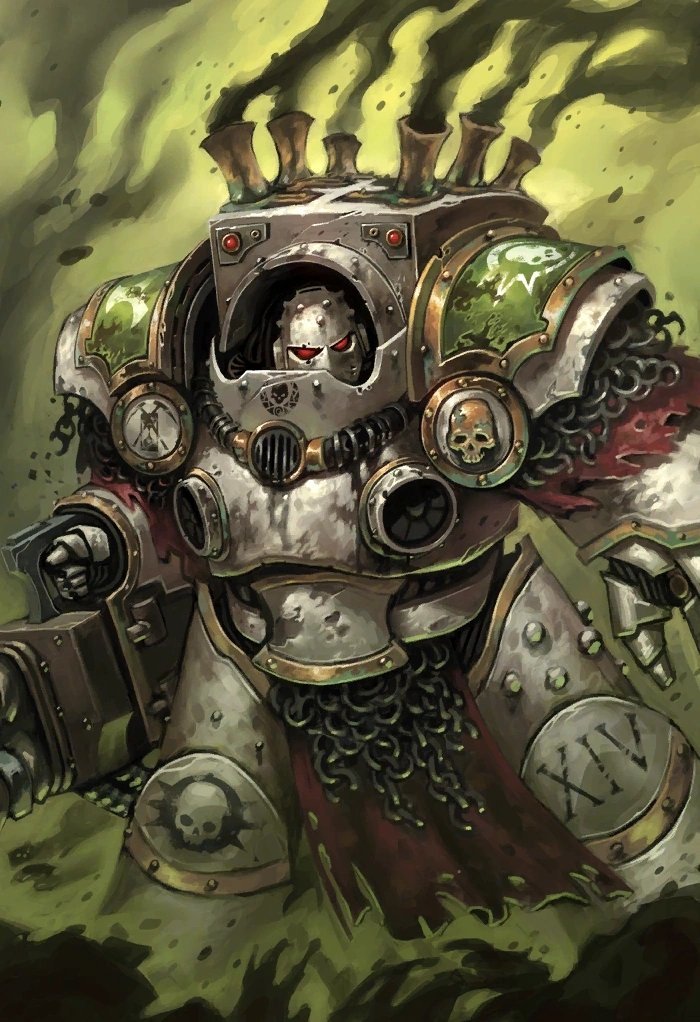 身穿定制铁骑型终结者装甲,后期被纳垢腐化,布满脓疮、腐肉、触手与瘟疫纹路。