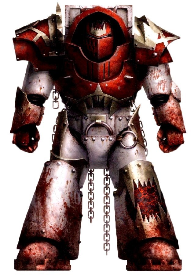 标配双持链锯斧、动力拳套,部分单位配备风暴爆弹枪,堕落后被恐虐附魔,武器上布满了鲜血符文与头骨装饰,能在杀戮中不断汲取力量。