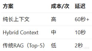 Hybrid Context比純長上下文便宜10倍,比傳統RAG貴50倍。