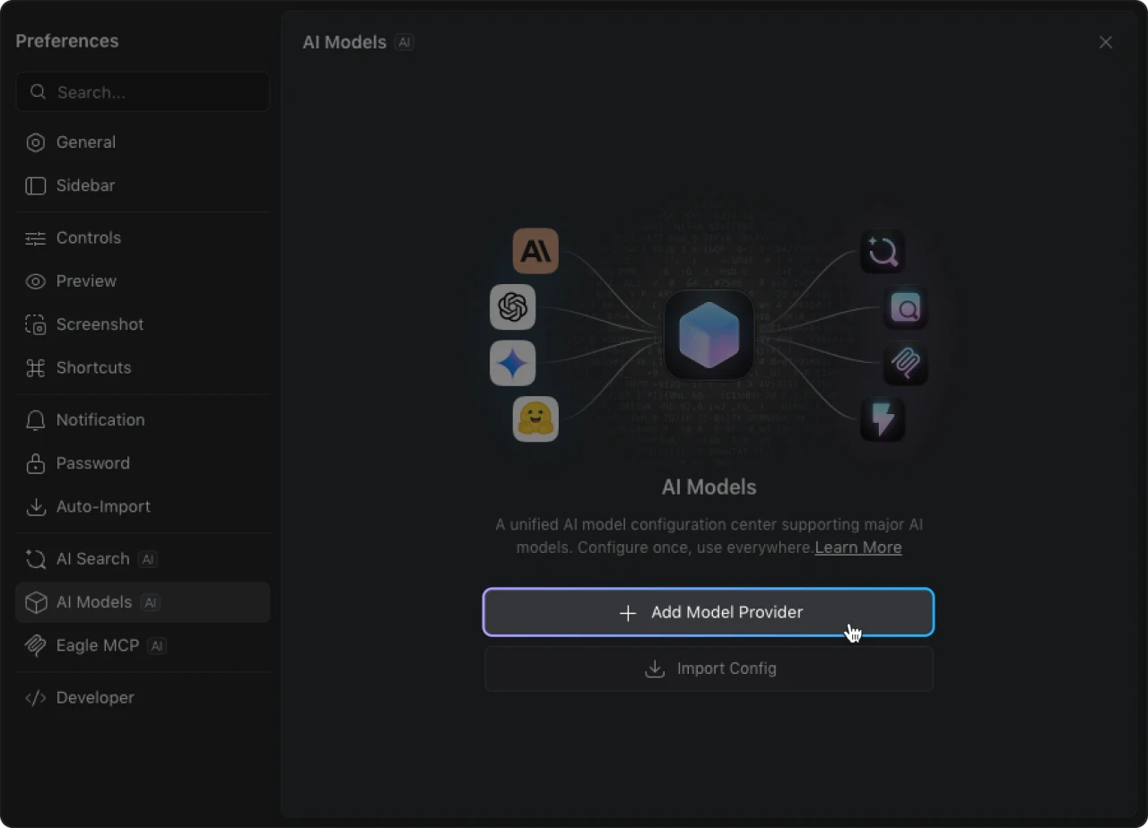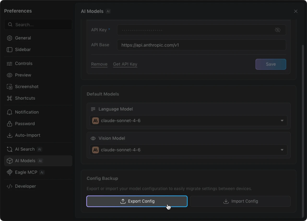 以前開發 AI 相關的 Eagle 插件,你得自己處理模型對接、API Key 管理、多廠商兼容等等。現在這些髒活累活,AI 模型套件全部幫你搞定了。
