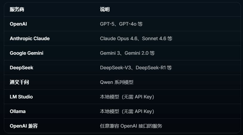 本地部署的用戶也沒被落下——LM Studio 和 Ollama 都是開箱即用,不需要任何 API Key,適合注重隱私或想省錢的朋友。