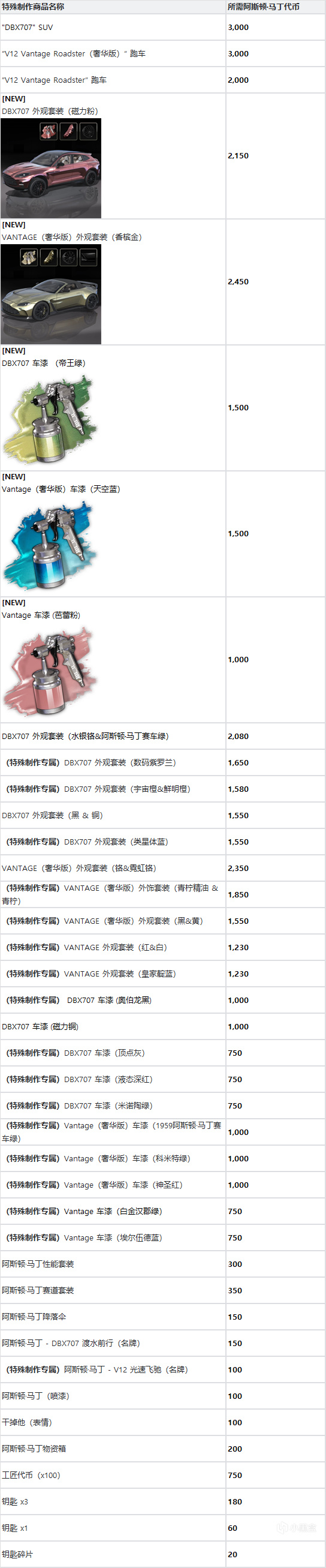 ※ 特殊制作 – 阿斯顿·马丁制作分页下线日期如下。请大家务必在下线前将获得的所有材料用完!