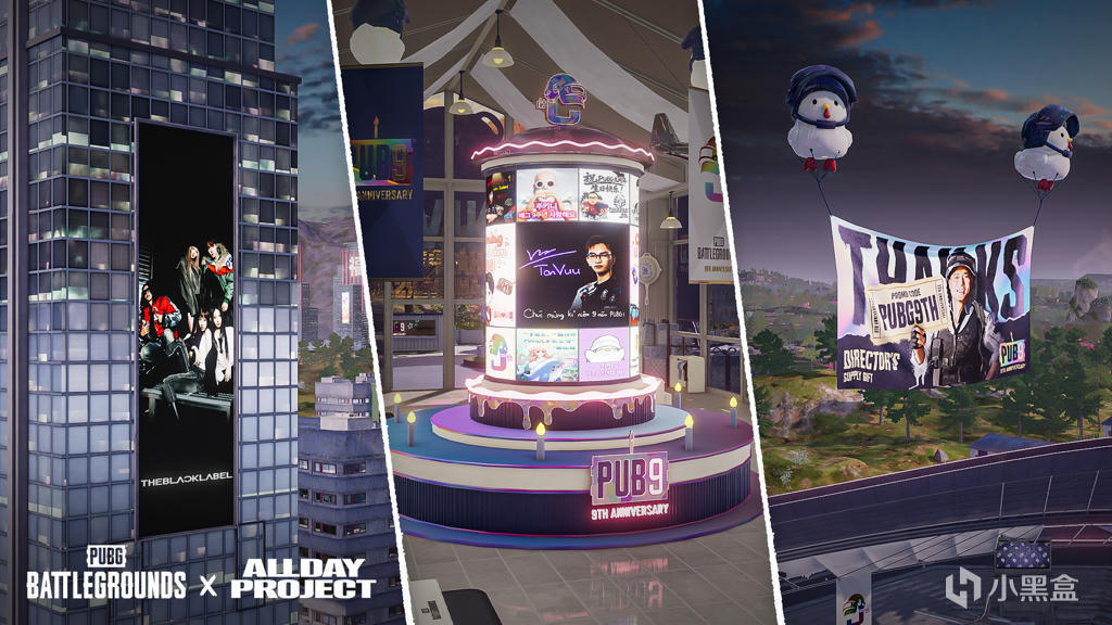 为迎接 PUBG 9周年,加入了 ALLDAY PROJECT和合作者共同庆祝的纪念显示屏。