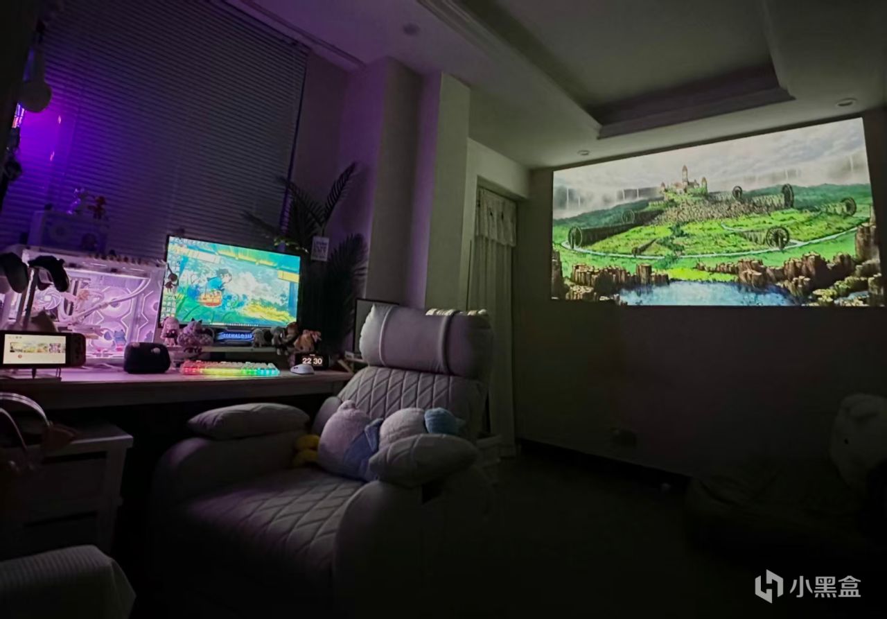 其實我還挺喜歡的,因爲投影剛好在右邊,關燈後還是很有氛圍感的,不過桌面還是很擁擠。