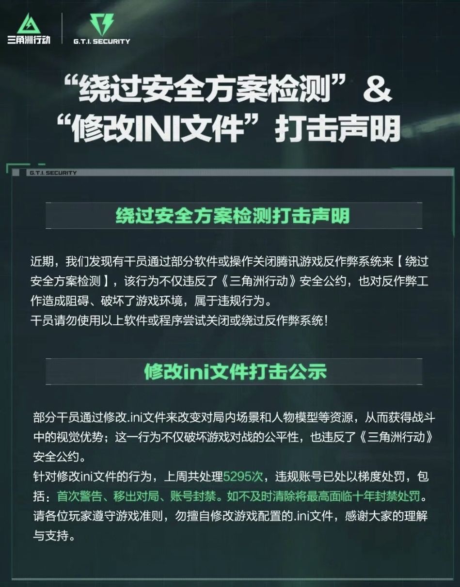 我查了查官方公告,發現官方去年就已經發過ini文件封禁相關,個人感覺對局內應該會封號,但截至目前羣u反饋說跟之前v5一樣,暫時沒拉閘。