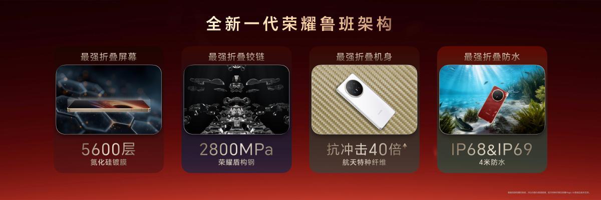 荣耀MagicV6拥有折叠屏行业唯一4米防水,并通过IP68&69防水防尘认证,号称是最可靠的折叠屏:最强的折叠屏幕!最强的折叠铰链!最强的折叠机身!最强的折叠防水!