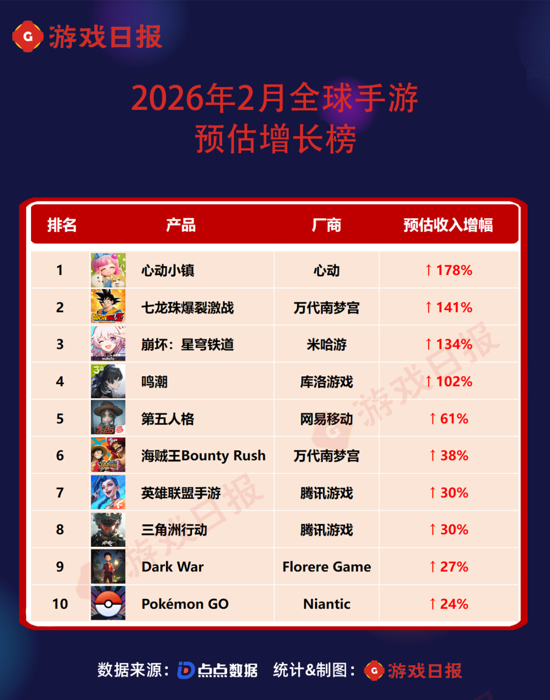 除此之外,檸檬微趣《浪漫餐廳》與世紀華通《奔奔王國》排名較1月均有所上升。萬代南夢宮《七龍珠爆裂激戰》二月舉辦了11週年慶,增長幅度超100%,進入榜單第十四位。