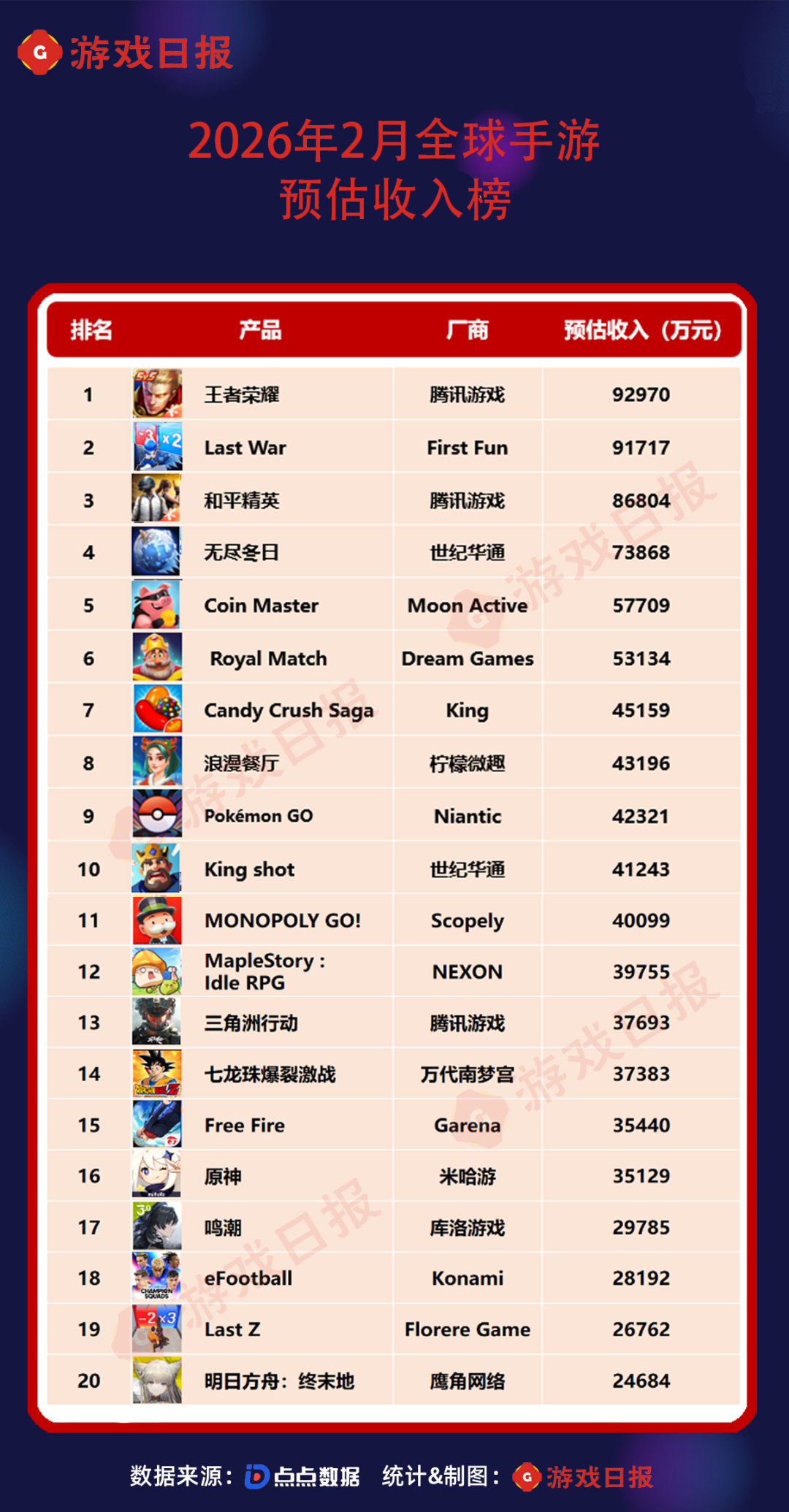 基於點點數據預估,我們統計了2026年2月份全球移動端遊戲收入TOP50榜單(iOS+Google Play)。TOP20產品2月份總收入約爲96億元,與1月份TOP20產品相比環比下降了約8.04%。