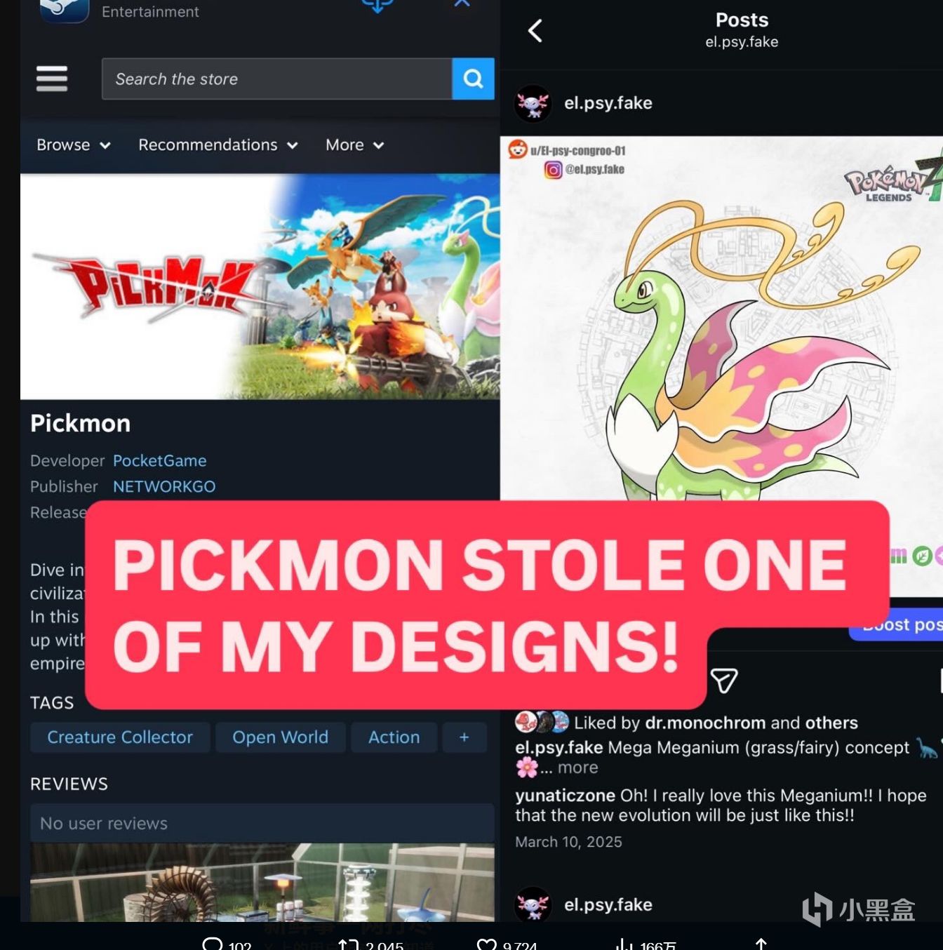 因与幻兽帕鲁和宝可梦高度相似的游戏,《Pickmon》被网友进一步指出疑似直接挪用了宝可梦同人画师的设计,话题在今天迅速升温。
