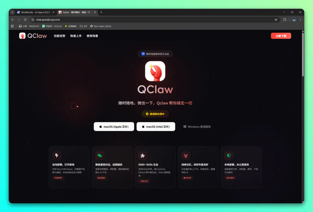 除了「Qclaw」AI 助手,騰訊還發布了免部署版 OpenClaw 小龍蝦(民間外號 “騰訊版小龍蝦”) 「WorkBuddy」完全兼容 OpenClaw 的所有技能。