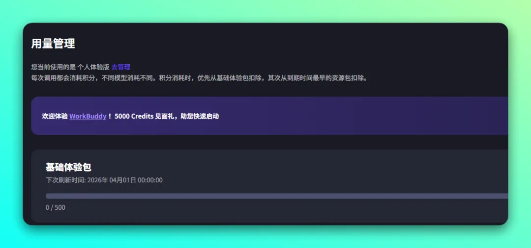 費用方面「WorkBuddy」現在推出無門檻體驗補貼,個人體驗版套餐每月固定贈送 500 積分,並且現在註冊登錄,額外再送 5000 積分。