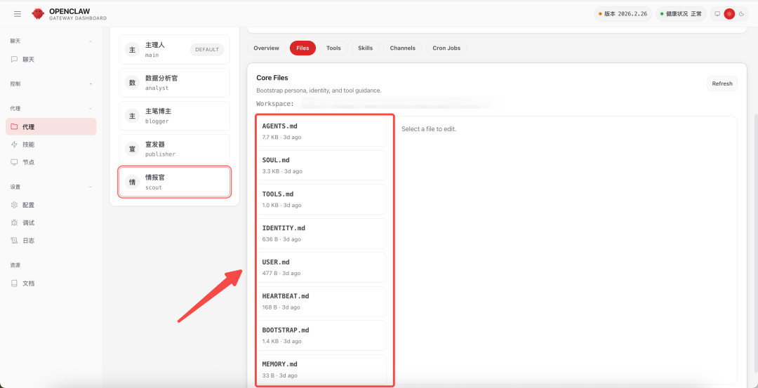 可以看到一個 Agent 裏面有 8 個 Markdown 核心配置文件,