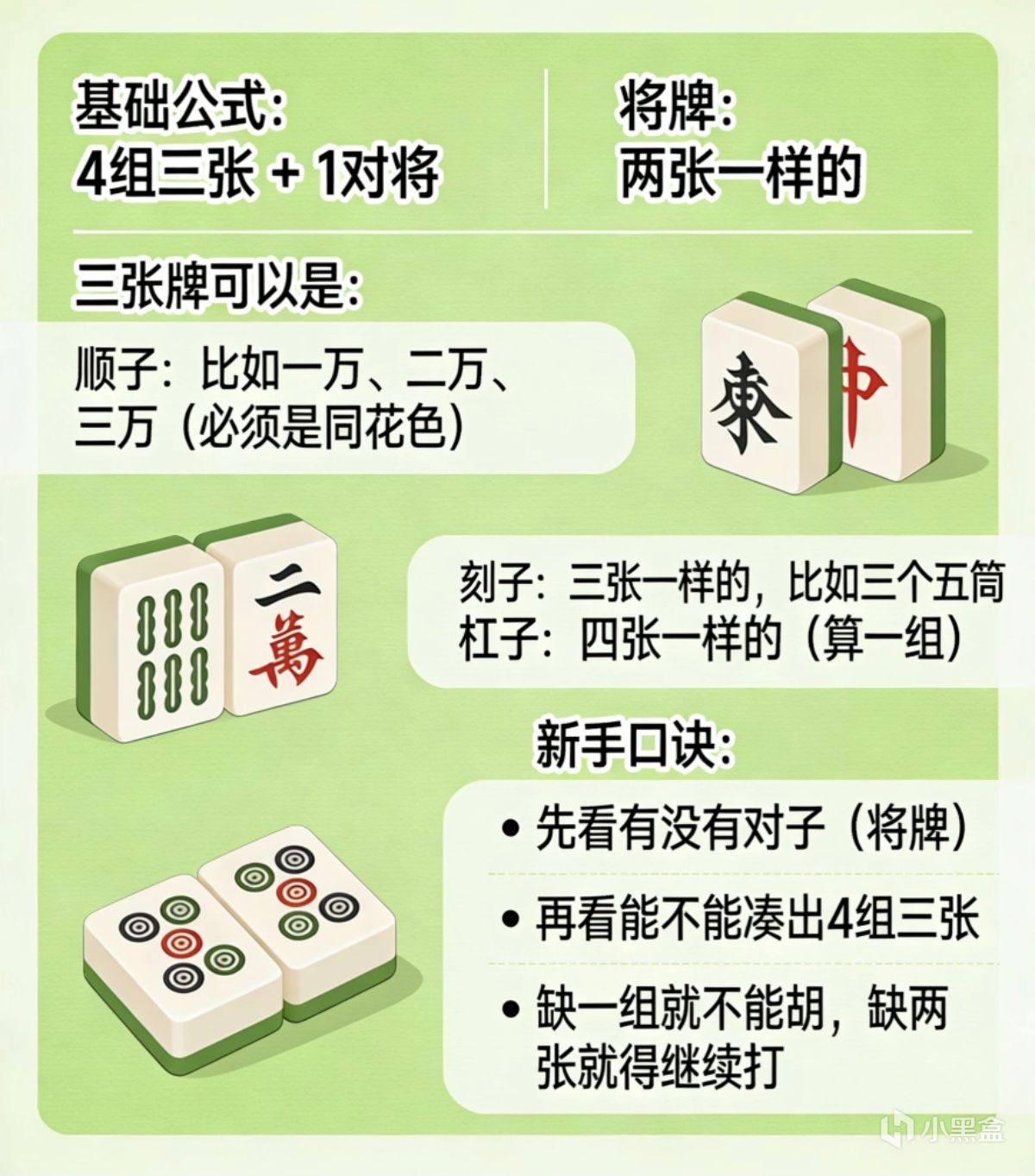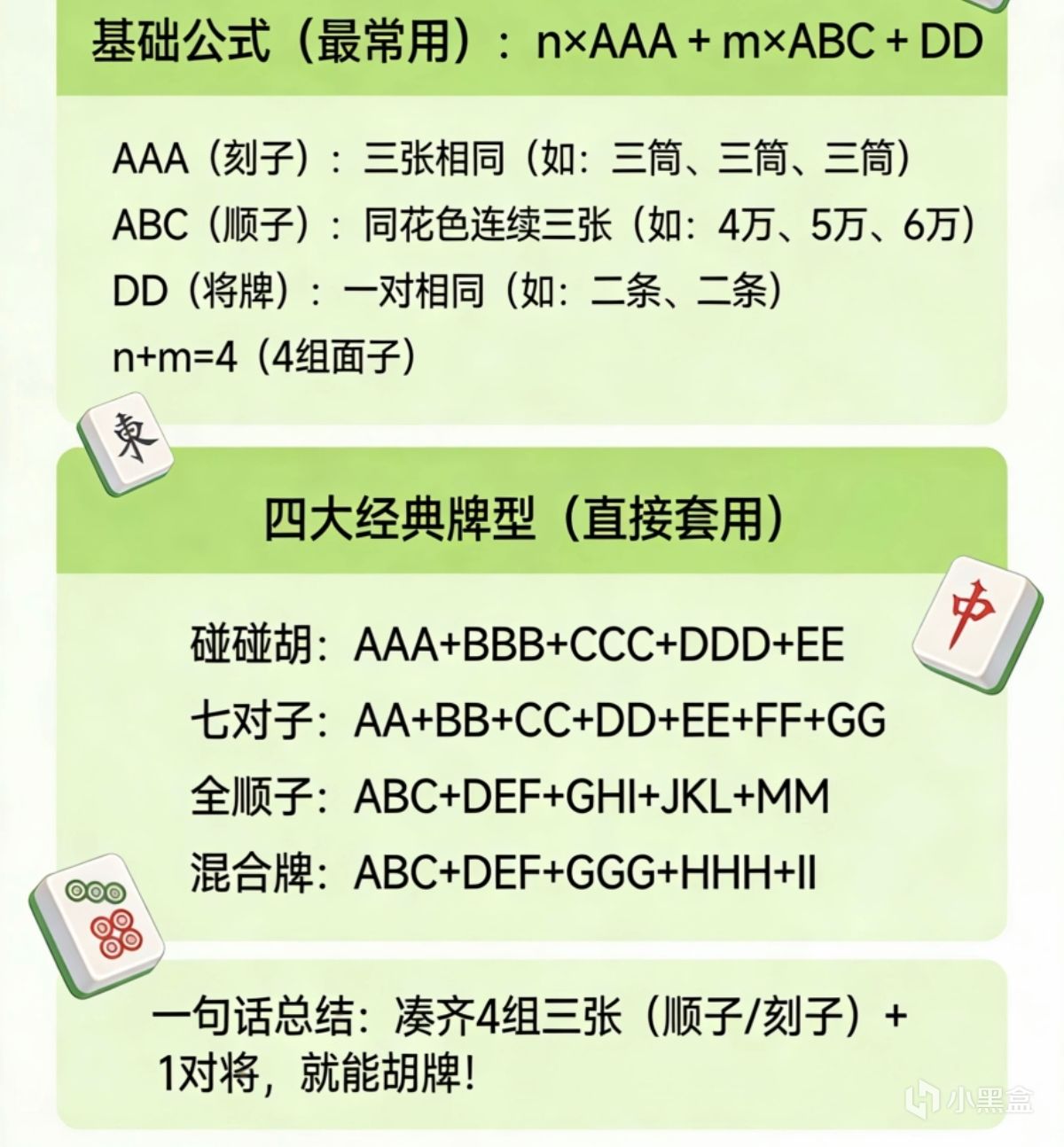 最簡單的公式: 胡牌 = 4組“三張牌” + 1對“將牌”