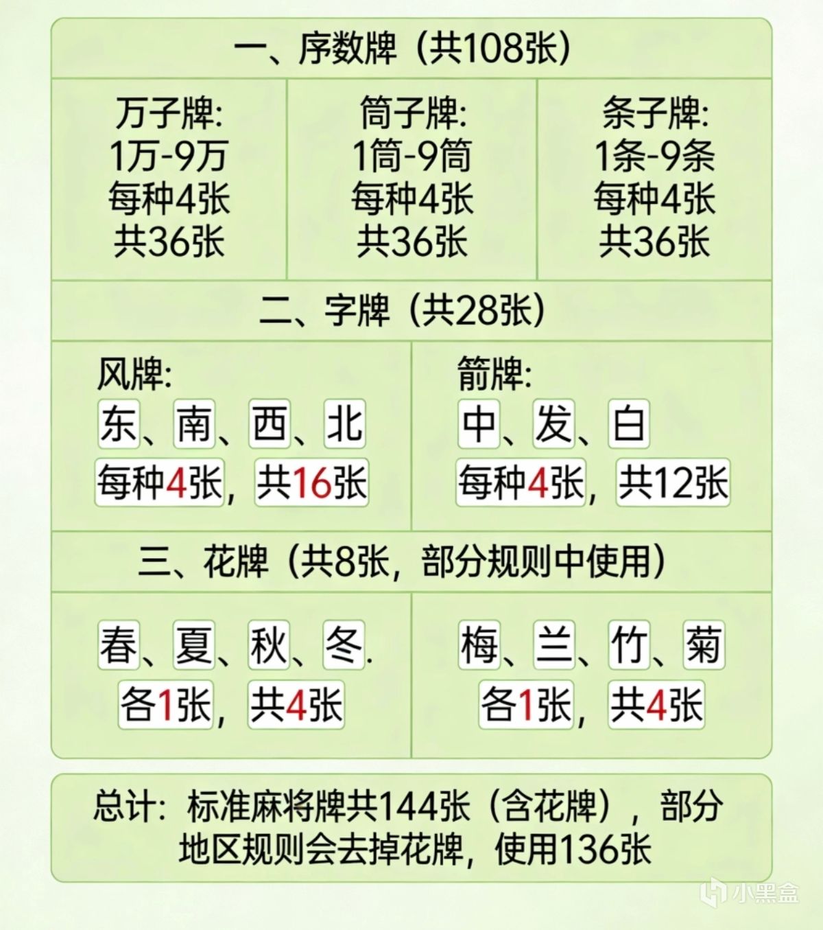 一副麻將牌分幾種:
