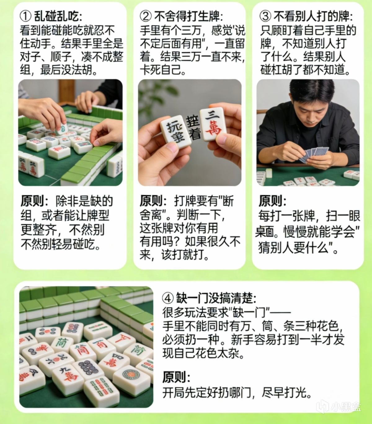 ③ 不看別人打的牌 只顧盯着自己手裏的牌,不知道別人打了什麼。結果別人碰槓胡了都不知道。 原則:每打一張牌,掃一眼桌面。慢慢就能學會“猜別人要什麼”。