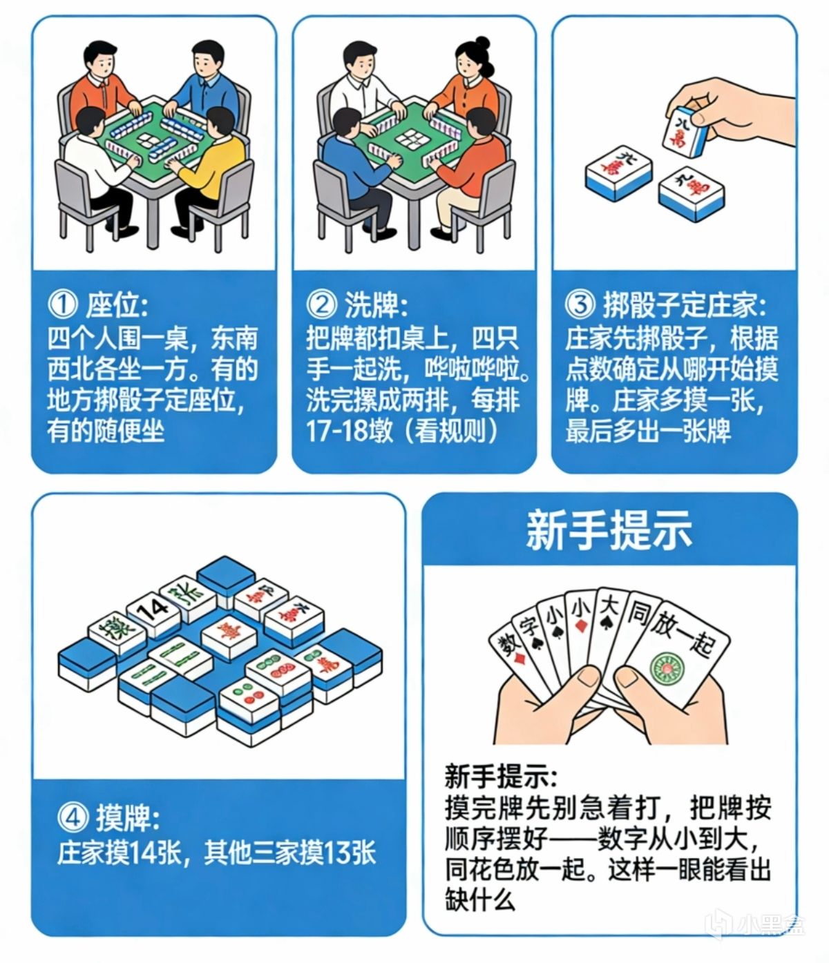 ④ 摸牌 莊家摸14張,其他三家摸13張。 把牌按順序擺好——數字從小到大,同花色放一起。