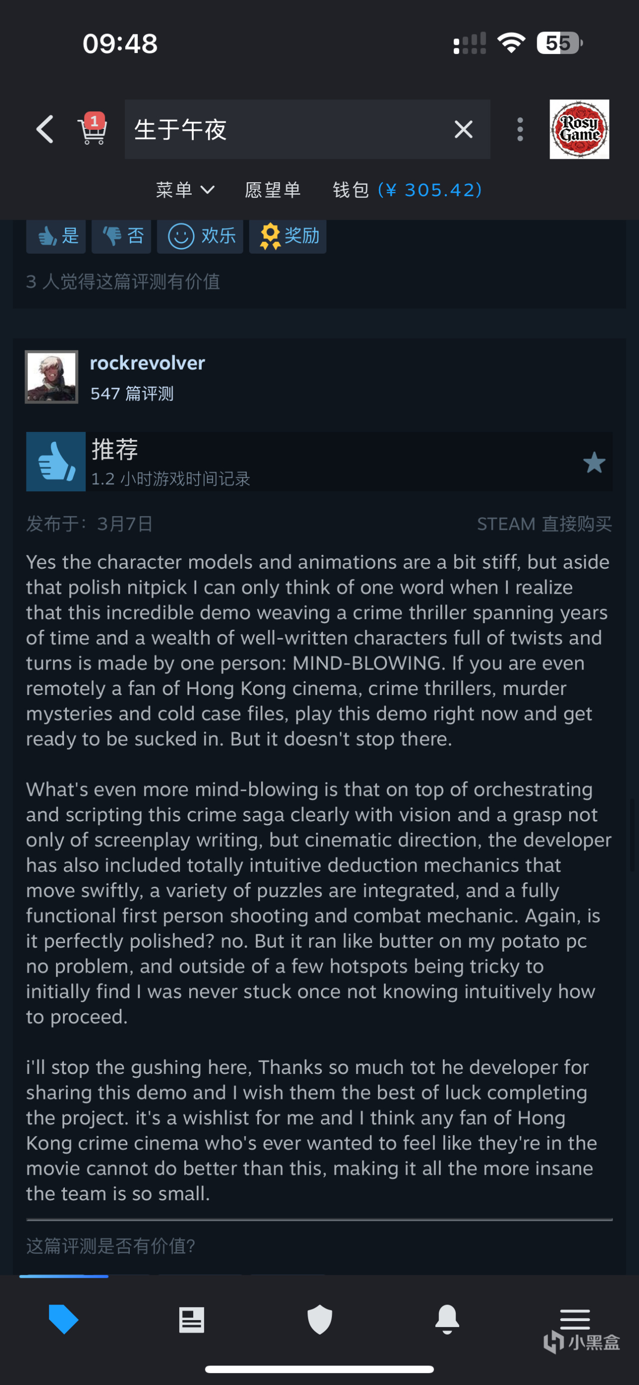 一大早打开Steam后台,发现《生于午夜》Demo喜提第一篇英文评测。