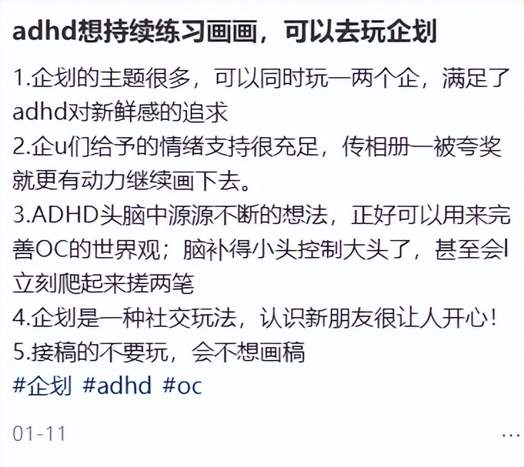甚至還有人半開玩笑半認真地說,玩企劃可以治療ADHD——因爲這裏既能滿足對新鮮感的渴求,又能從企友們那裏獲得源源不斷的正向反饋。