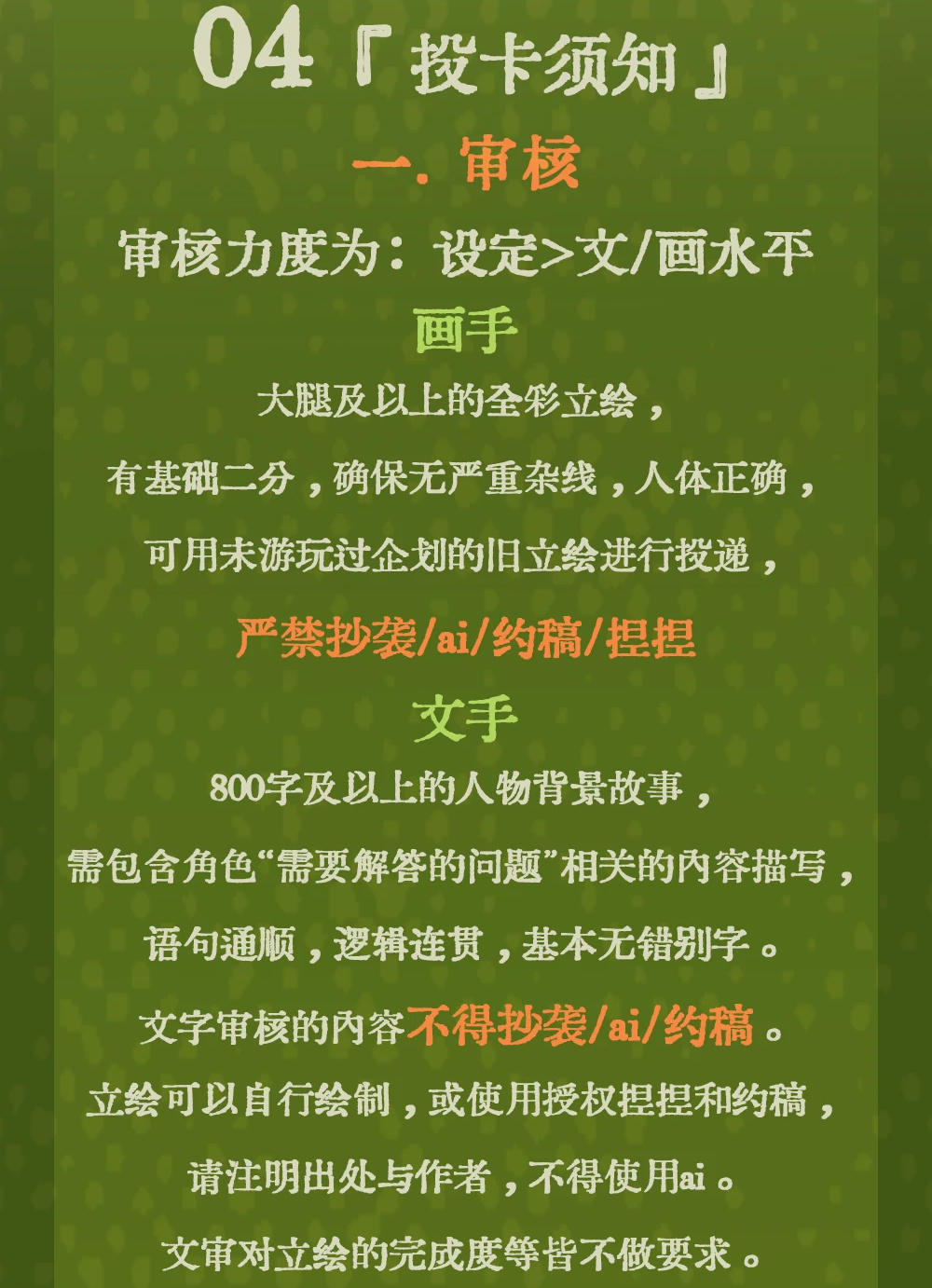 先別急,聽我給你分析。首先,在參加任何一個企劃之前,先得了解清楚他們的參與方式以及審覈機制。一般情況下,企劃的參與方式有:純文(即只接受文字創作)、純畫(即只接受繪畫創作)、文畫(即接受文字創作與繪畫創作)這三種。不過也有的企劃要求即便是文手,也得提供一個人物的設定圖,以便更好開展企劃。