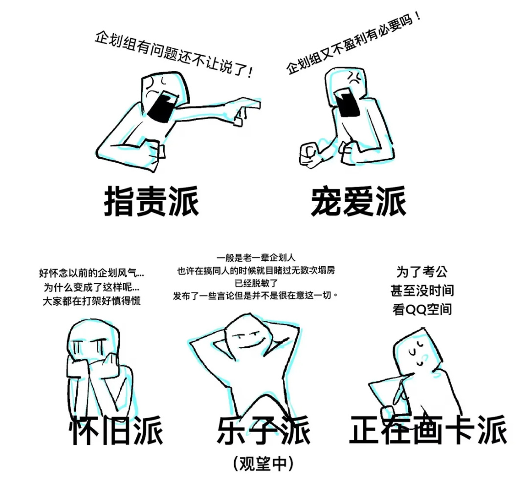 企劃的肝度一般分爲兩種:養老企與肝企。養老企,顧名思義,主打的就是輕鬆休閒娛樂,不需要高強度地進行創作和互動;肝企,則需要參與者根據企主的要求,強制完成一些互動環節的創作。雖說肝企耗肝,整得比上班還累,容易因高強度創作而疲憊,不過爲了保證大家的創作積極性,企主一般也會準備更豐富詳細的故事線以及互動性較強的運營機制,以此進行“風險對沖”。