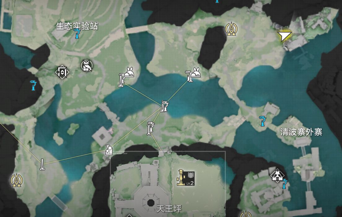 新地图清波寨无据点 因此需要手动拉电线过去 清波寨大门位于景玉谷东北角 稍微立一点电杆就到了