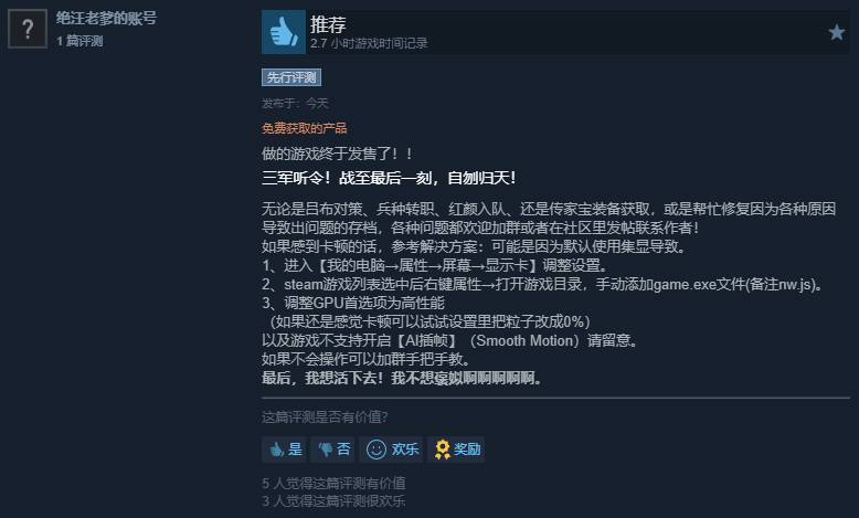 《十三州行动:三国搜打撤》发售后,你可以在Steam评论区看到绝汪非常有个人特色的一段留言,这几乎是只有在个人独立游戏开发者身上才能看到的奇景,约等于亲自站在街口吆喝叫卖: