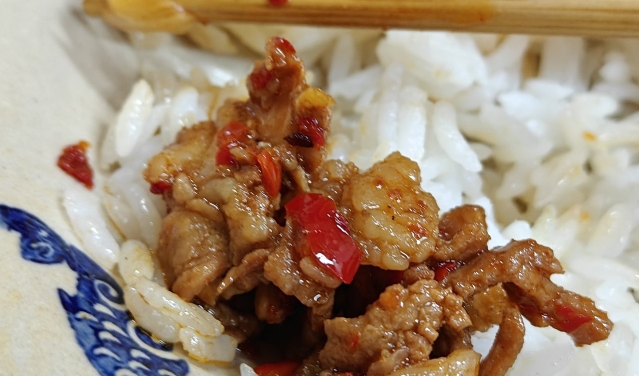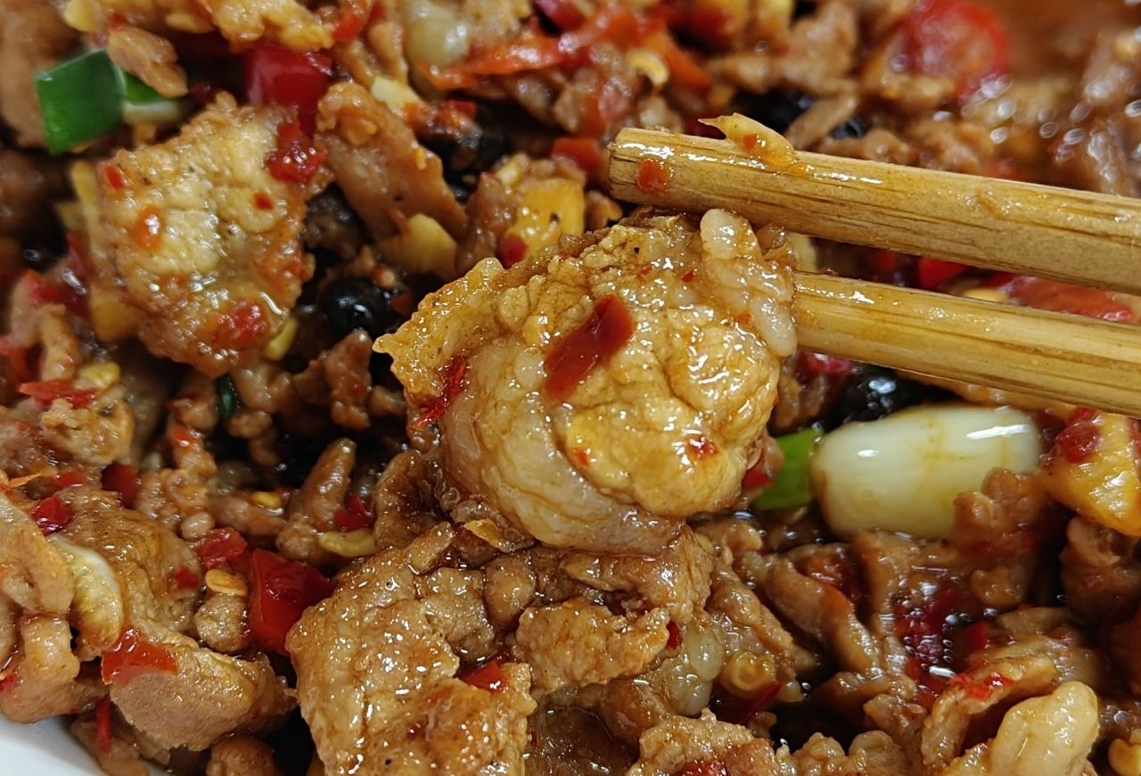 所谓肉炒肉,是先把五花肉或带肥的前腿肉下锅煸出多余油脂,然后再加入瘦的前腿或里脊急火快炒而成,主料辅料都是肉,爽吃!调味上以蒜、剁椒、豆豉、酱油为主,是酱香豉香加上发酵的风味,咸香酸辣,味道浓郁极其下饭。