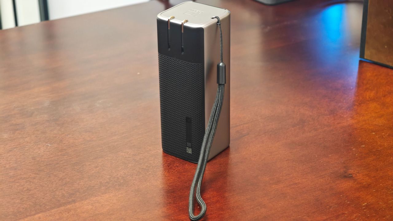 顶部留有挂绳口,折叠插脚也留有一小段突出,方便拔出。