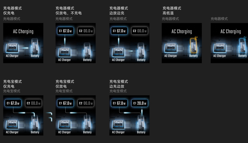 充电器模式下单口输出最大为67w,多口输出 67W+22W,内置电池不参与放电;