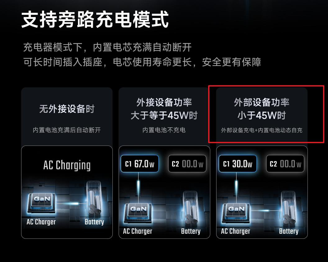 支持旁路充电,外部设备功率<45W时,内置电池动态自充。