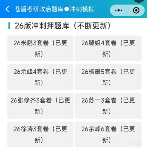 小程序里面是有其他考研名师出的卷子,可以多写写看。比如说腿姐的腿八+腿四,徐涛老师的徐六,以及米鹏的米6等。一般题目下面就会有同学写的解析,没事可以多看看。说不定比老师讲的好。