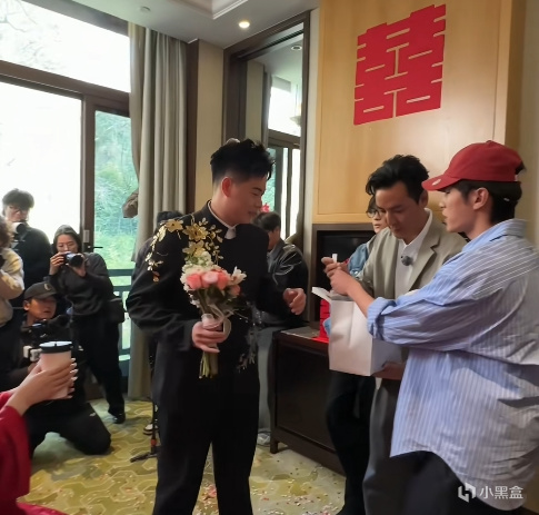 代旭戴上喜庆的小红帽帮忙活跃气氛,井胧则用手机记录下这难得的瞬间,三人还一起为新人送上 “一见倾心” 的祝福。