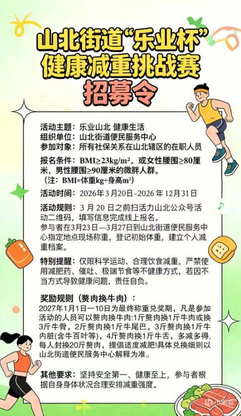减重成果要到 2027 年初兑换,减 1 斤能换 1 斤牛肉或 3 斤牛骨,减 2 斤换牛尾巴,减 3 斤换牛内脏,减 4 斤能换牛舌,最多能兑 20 斤赘肉的奖品,主办方也提醒大家别过度减肥。