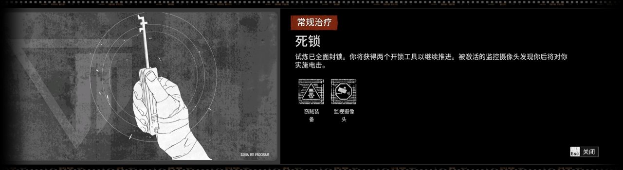 “試煉已全面封鎖。你將獲得兩個開鎖工具繼續推進。激活的監控攝像頭髮現你後將對你實施電擊。”