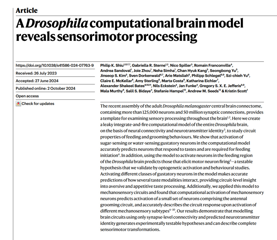 這隻果蠅的大腦最初來自2024年Nature一篇重磅論文,研究團隊把果蠅全腦connectome完整掃描下來,用最簡單的Leaky Integrate-and-Fire神經元模型,只靠連接圖、突觸權重和興奮抑制標記,就讓它在虛擬身體裏活了過來。