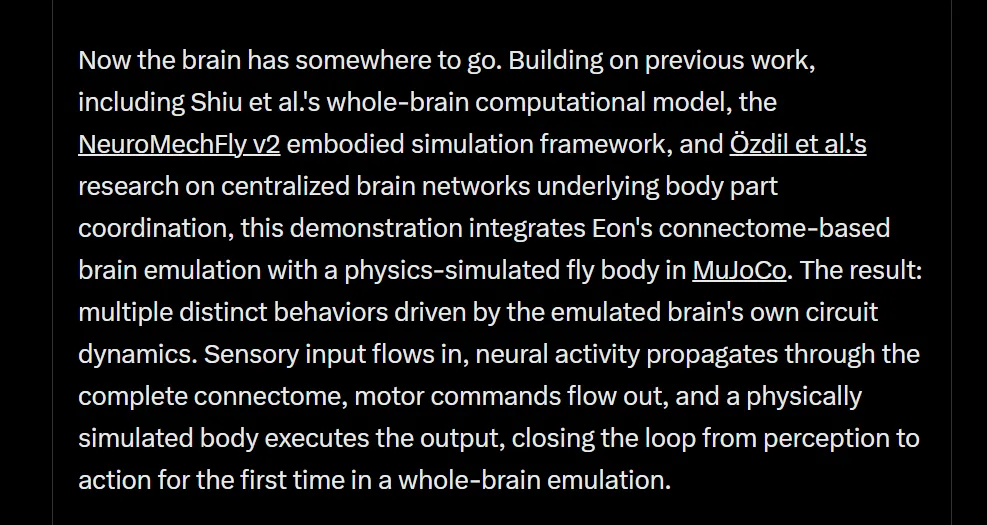 Eon Systems的團隊說,他們只是把生物學最硬的connectome數據餵給了物理引擎,剩下的,是大腦自己決定要怎麼動。
