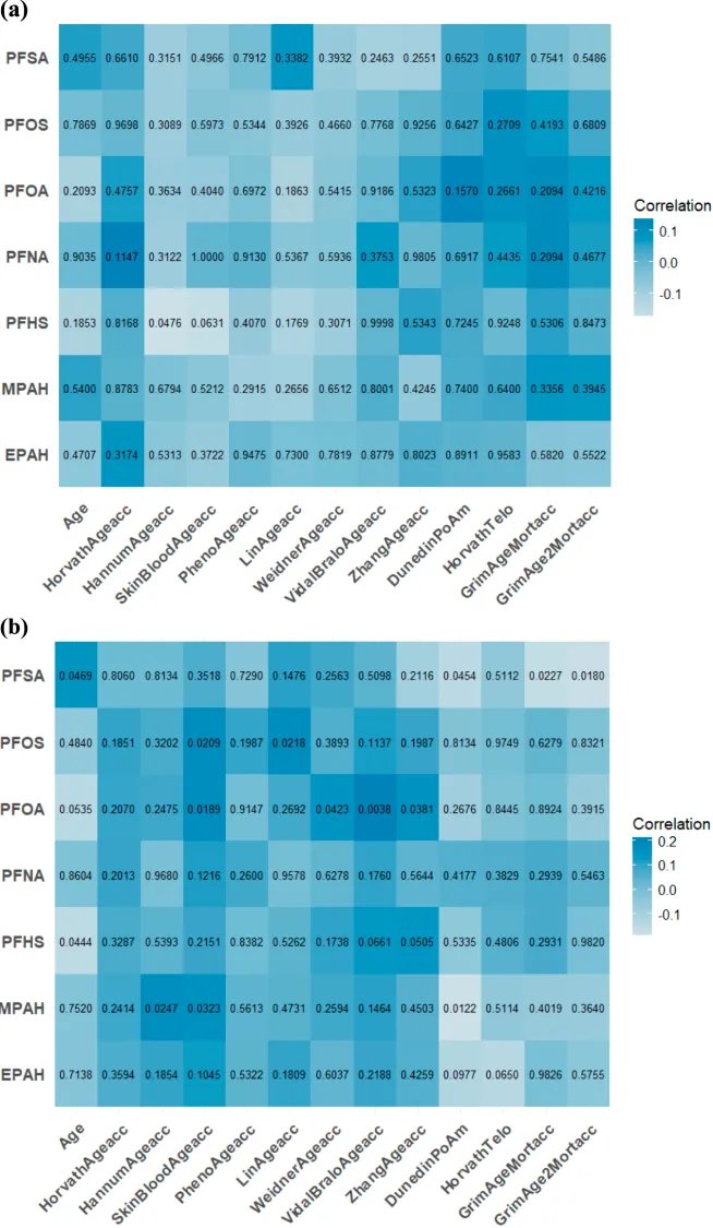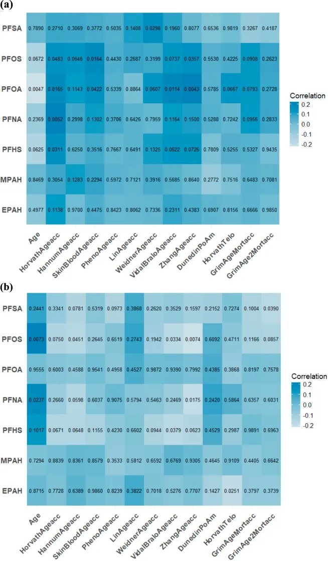 (a) 1999-2000 年 NHANES 中男性年齡、多氟烷基化合物和 12 種 DNAm 老化算法的 Spearman 相關係數; (b) 1999-2000 年 NHANES 中女性年齡、多氟烷基化合物和 12 種 DNAm 老化算法的 Spearman 相關係數。