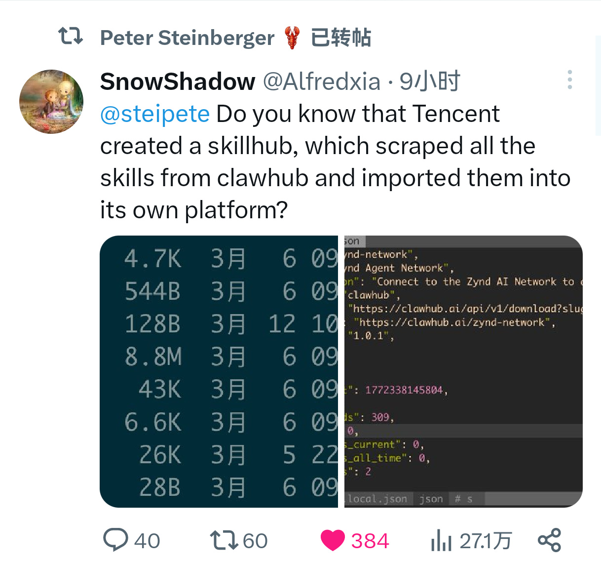 近日,腾讯的SkillHub正式上线,但今天有位网友通过推特“呼唤了”龙虾之父并告述他:腾讯在抄袭他的软件