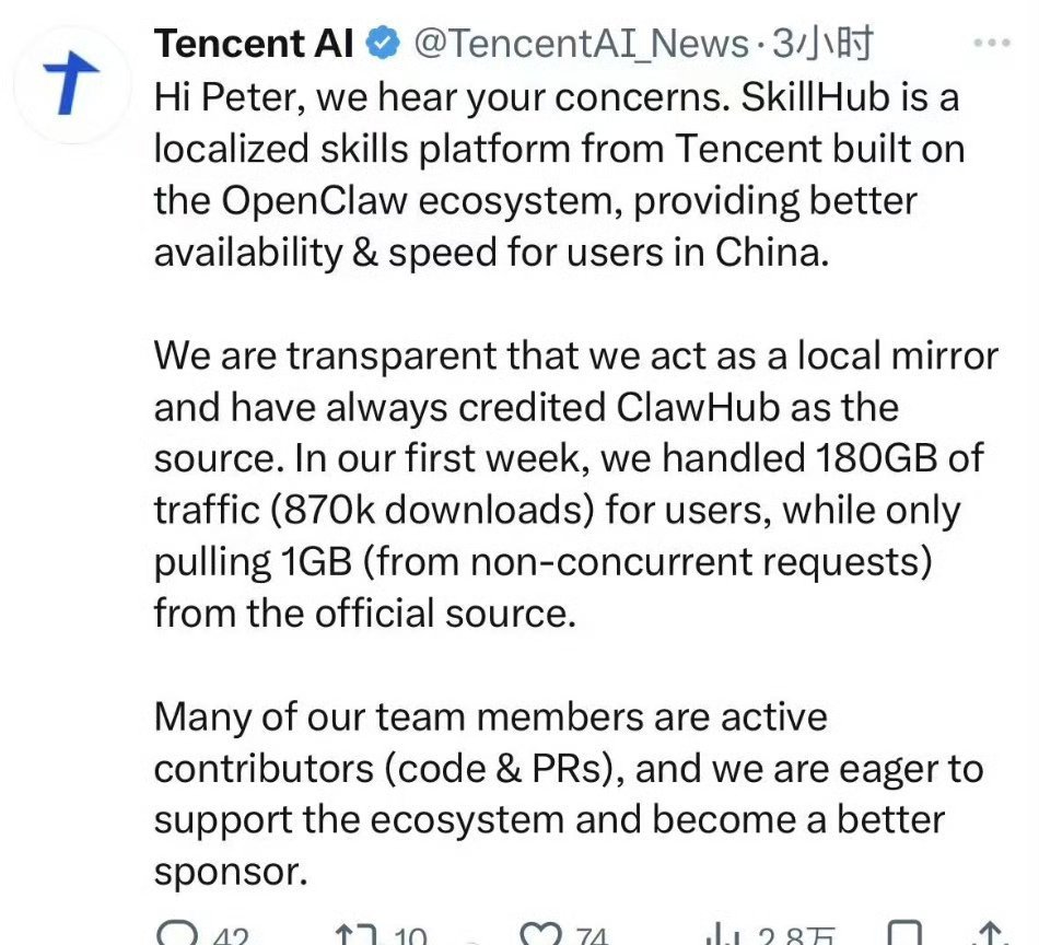 你好,Peter,我们听到了你的担忧。SkillHub 是腾讯基于 OpenClaw 生态系统构建的本地化技能平台,旨在为中国用户提供更好的可用性和访问速度。 我们一直透明公开地表示,我们作为一个本地镜像在运行,并始终将 ClawHub 注明为来源。在运营的第一周,我们为用户处理了 180GB 的流量(相当于 87 万次下载),而仅从官方源非并发地拉取了 1GB 数据。 我们团队的许多成员都是该生态的活跃贡献者(提交代码和PR),我们也热切希望支持整个生态系统,并成为一个更好的赞助者。